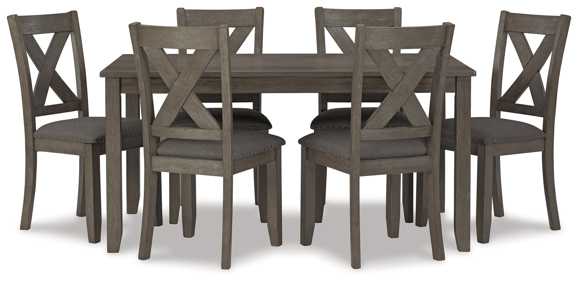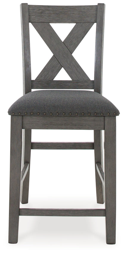 Perfect portion. Striking a simply chic pose, this counter height dining set is crafted with fascinating flair. A subtle gray wash finish gives the clean-lined design a casually cool sensibility. Plushly cushioned seats in a soft, neutral upholstery add to the allure. During casual get-togethers, daily dinners and family game nights alike, this set serves up stylish function.