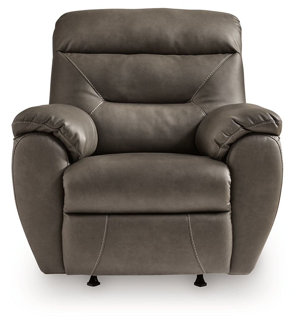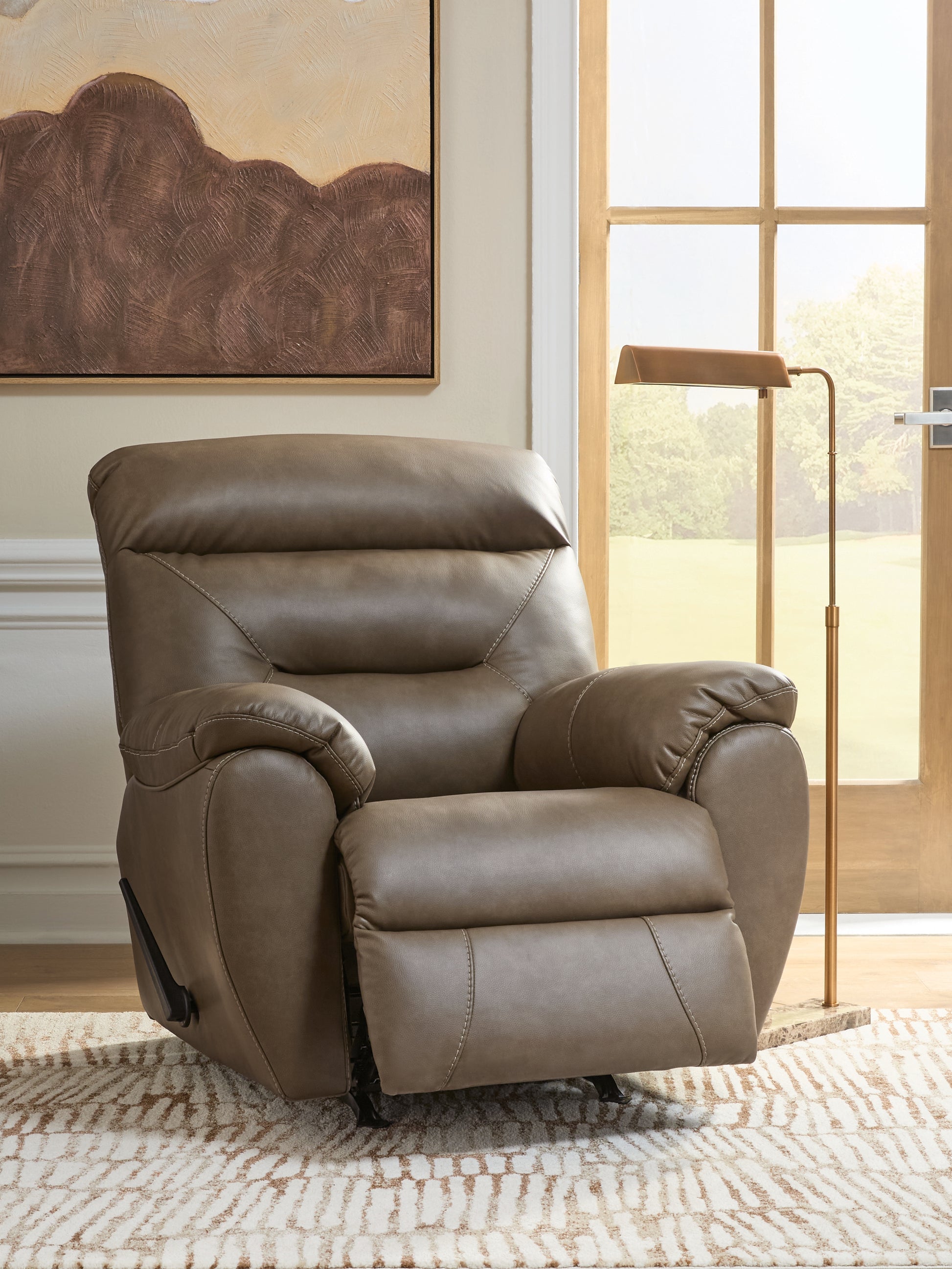 There's no shame in zoning out and kicking back—not when this rocker recliner makes you look so good doing it. Heavyweight warm brown faux leather upholstery is enriched with prominent stitching, a supportive back and pillowy armrests. And with one easy pull, you’re on your way to endless relaxation.
