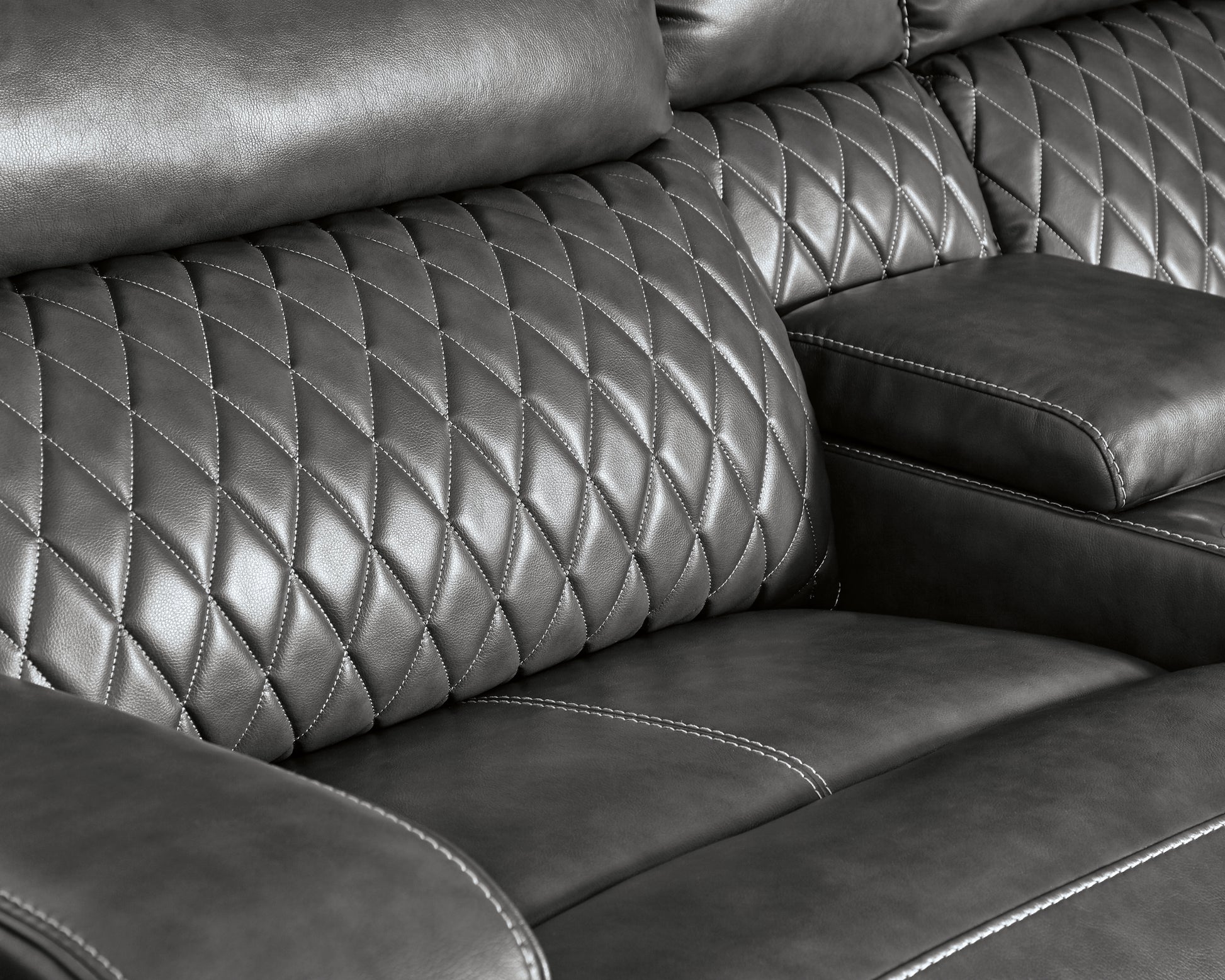 City sleek living. This loveseat is loaded with luxury. An ultra-stylish diamond stitch design pumps up the piece with eye-catching drama. And talk about style with purpose. This stunning selection supports you with a high back and faux leather upholstery in gorgeous gray. Its USB charging station powers up your tech life as you recline in comfort.